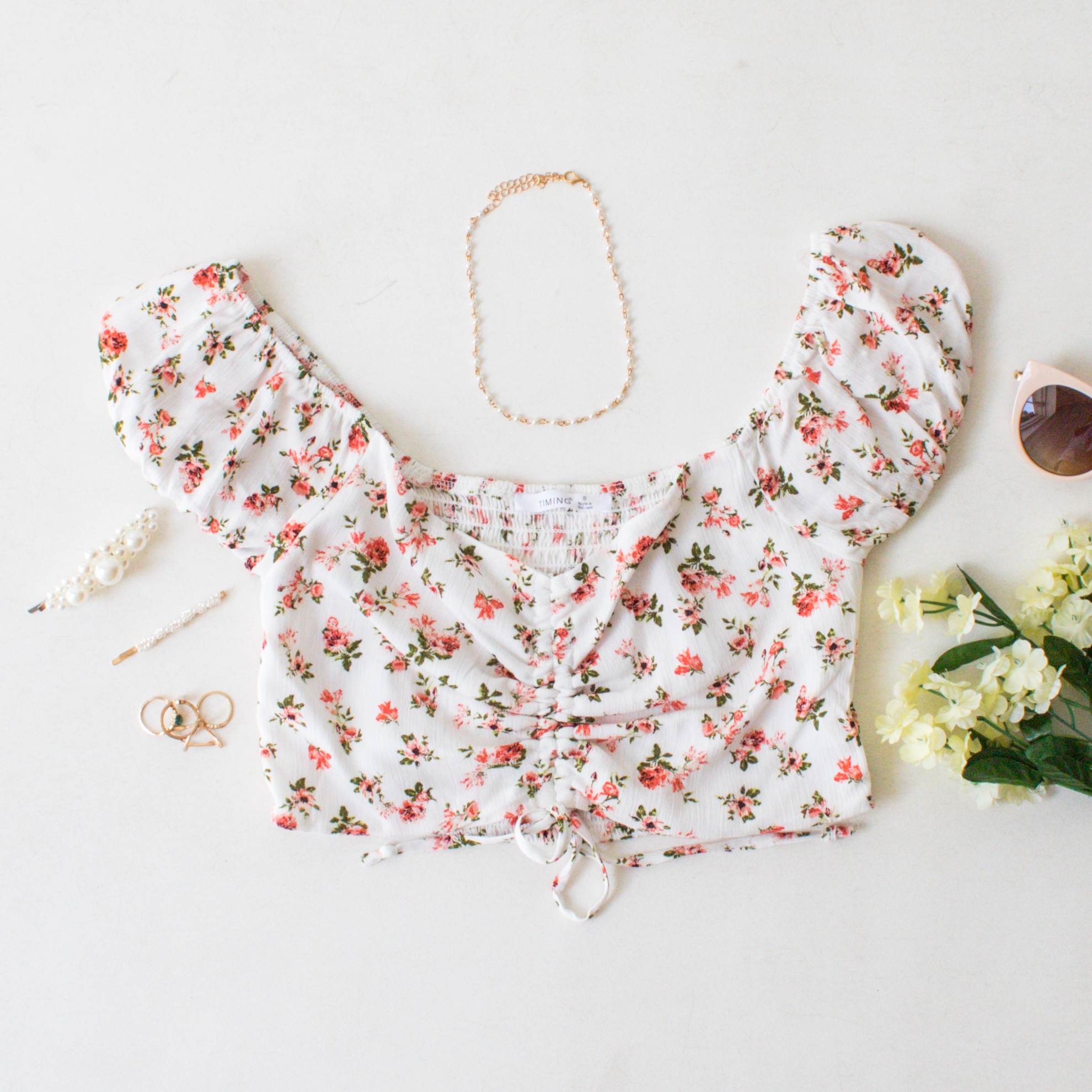 -White Color-Pink Floral Pattern-Smocked Elastic Back-Ruched in Front-Front Rushing is Adjustable-Short Puff Sleeves (Elastic)-Sweetheart Neckline-Crop TopMaterials:100% RayonWN8536 CROP RSTF